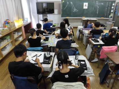 3年生の複数のクラスが毛筆に取り組んでいました。呼吸を整え、姿勢を意識して、墨で文字を書いている様子から、落ち着いて生活しているのがわかります。