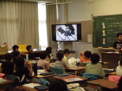 今日も暑い一日でしたね。昨日紹介した3年生の学習「かげで変身」をほかのクラスでも行ていました。今日のほうが、日差しが強くて、濃い影ができていたと思います。外で影を作って写真にとったあと、教室で各グループの写真を見合って、形のおもしろさを感じていた子どもたちです。