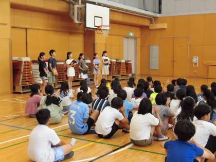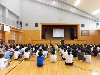 授業前の朝の時間、5年生が体育館で学年チャンプ本を決める「ビブリオバトル」を行いました。ここに至るまで、各クラスで行ったビブリオバトルを勝ち抜いてきた子どもたちです。自分のおすすめの本を、聞いている人たちに紹介しています。聞いている子どもたちも関心をもって真剣に、集中して聞いていました。