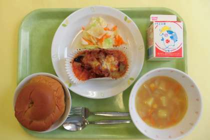 今日の主菜は、鮭のピザ風です。鮭にトマト味のピザソースとチーズをかけてオーブンで焼きました。鮭に含まれるビタミンDには、チーズに多く含まれるカルシウムの吸収を助ける働きがあります。