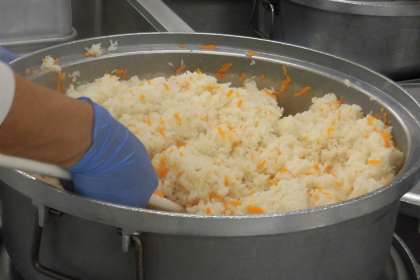 今日の給食は、キャロットライスのクリームソースがけです。みじん切りにしたにんじんをお米と一緒に炊き、その上に鶏肉と野菜が入ったクリームソースをかけていただきます。
