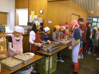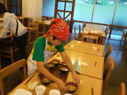 夕食開始30分前、食事係は食堂の前に集合します。全員の配膳を始めるのです。とてもよく働く食事係です。