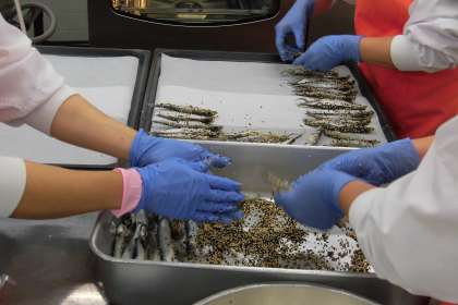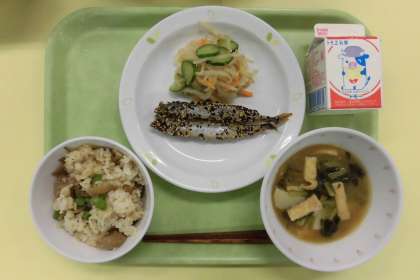 今日の主食は豚肉とごぼうのごはんです。豚肉とごぼうにしょうゆ・みそ・さとう・しょうがを加えて味をしみ込ませ、ご飯と混ぜ合わせました。みそ汁には、東京都江戸川区産の小松菜が入っています。写真は、ししゃもにごまをまぶしている様子です。