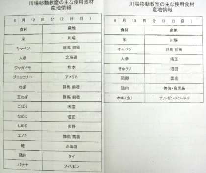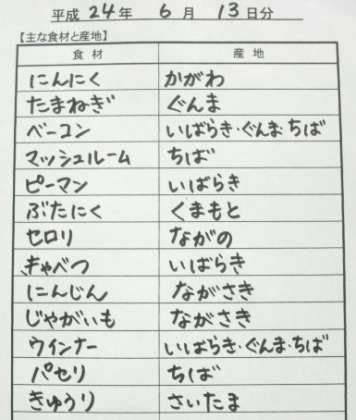 6月13日給食食材産地および6月12日・13日川場移動教室食材産地
