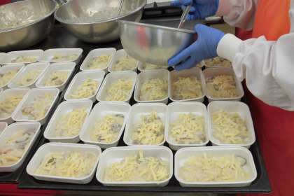 今日の主菜はマカロニグラタンです。マカロニには、貝の形やねじった形など色々な形があり、料理に合わせて使い分けます。今日のグラタンには、ソースとよく絡むように、シンプルな筒形のマカロニを使っています。