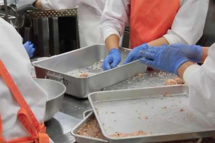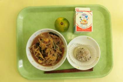 今日の給食は、リクエストが多いみそラーメンです。朝早くに、かつお節のだしと鶏ガラのだしをとり、じっくり煮込んで作りました。珍珠丸子は、肉団子にもち米をまぶして蒸した料理です。