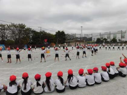 2年生は「心をひとつに全力、協力、えがおー」と声を合わせ気持ちを合わせて、練習に取り組んでいました。