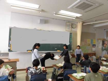 昼の放送で読書委員会から4,5,6年生の表彰の紹介があり、そのあと賞状の伝達で教室に行くというので、その様子を見せてもらいました。学校中で一番たくさん読んだ子がとてもうれしそうに受け取っていました。このクラスのほかの子どもたちもうれしそうでしたし、この企画を考えた読書委員会の子どもたちもうれしそうでした。