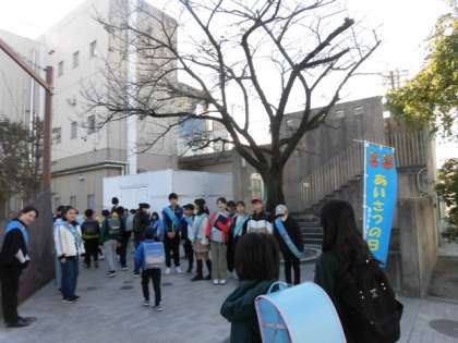 土曜授業日です。月に一度のあいさつデーで、土曜授業日でない砧南中学校の生徒さんは来ませんが、保護者の方も含めいつもより大勢の大人や子どもが登校のあいさつ運動を行いました。3年生のあいさつ当番と代表委員会児童のさわやかな声が響いています。