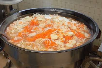 今日の主菜は、白身魚のフライです。今日は「メダイ」という魚を使っています。味にクセがないので、色々な料理に使われます。キャロットポタージュは、にんじんと玉ねぎ、じゃがいもに牛乳を加えて作りました。写真は、ミキサーにかける前の野菜を煮ている様子です。