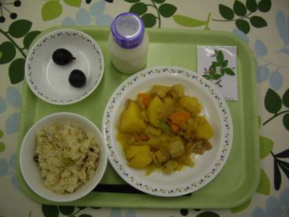 今日の給食には「はぎご飯」にちなんで、はぎの花が添えられていました。