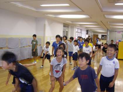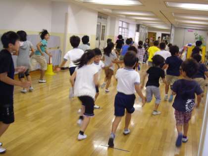 朝の時間に校庭、体育館、教室、オープンを使って、計画した遊びをしました。