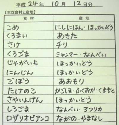 10月12日の主な給食食材産地です。