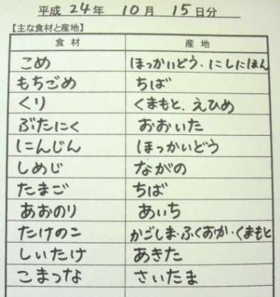 10月15日の主な給食食材産地です。