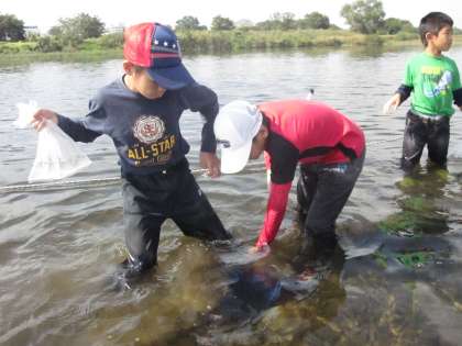 多摩川河川敷で水辺の楽校と草地の楽校をしました。ドジョウやショウリョウバッタなど、網で捕まえた小さな生き物を手に取ったり観察したりして、楽しく学習しました。(3年担任 太田)