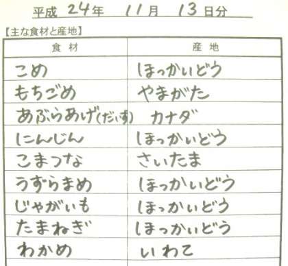11月13日給食食材産地