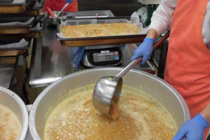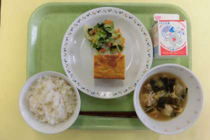 今日の主菜は、具だくさん千草焼きです。千草焼きは、卵に細かく刻んだ具材を入れて焼いた料理です。給食の千草焼きの中には、鶏肉、玉ねぎ、にんじん、ねぎ、切り干し大根が入っています。