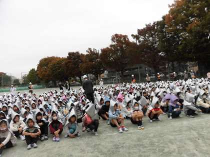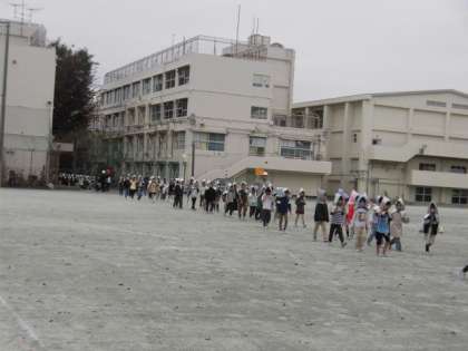 月に一度の避難訓練を行っています。今日は二次避難場所の砧南中学校まで避難しました。先生の指示に従って、静かに移動し集合しました。1000人を超える児童数ですので、15分くらいかかるかもしれないと予想していましたが、11分ぐらいで全員到着することができました。集まってから、話を聞くときも一切しゃべらず、みんな真剣に取り組んでいました。とても感心しました。