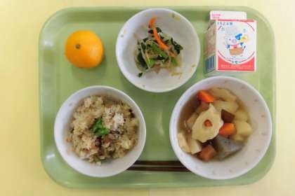 今日の給食は、おでんです。今日のおでんには、大根、にんじん、じゃがいも、こんにゃく、昆布、さつま揚げ、生揚げ、ちくわぶが入っています。大根は世田谷区の農園でとれたものを使っています。