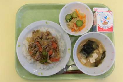 今日の給食は、豚肉のしょうが焼き丼です。しょうがには、体を温める働きがあり、寒くなる季節に食べたい食品です。かぜ予防には野菜を食べることはもちろんですが、肉や魚、たまご、大豆製品などのたんぱく質をしっかり食べることも大切です。