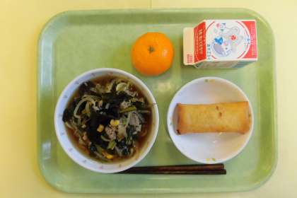 今日の主食は、しょうゆラーメンです。みそラーメンが人気ですが、しょうゆラーメンのリクエストもありました。コーン、ねぎ、小松菜、もやしなど野菜もたくさん入れました。今日の春巻きは、ツナ、じゃがいも、チーズが中に入っています。