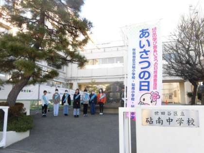 今日は、自立の学び舎のあいさつの日です。小学校の正門に砧南中学校の生徒がきて、一緒にあいさつをしてくれました。一方、中学校には砧南小学校の代表委員会の子どもたちが出向いて、あいさつの声を響かせました。このような交流を定期的に行っています。同じ地域に住んでいる小学生と中学生が自然にあいさつできるのはとてもいいと思います。