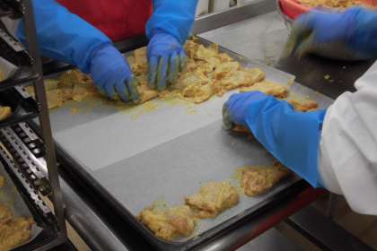 今日の主菜は、タンドリーチキンです。タンドリーチキンは、インド料理の一つで、とり肉をヨーグルトやスパイスに漬けて焼きます。今日の給食では、ヨーグルト、カレー粉、にんにく、しょうが、ケチャップ、たまねぎ、塩、こしょうで味付けしています。