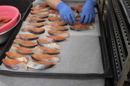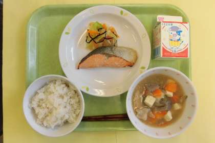 当時の献立は「おにぎり、焼き魚、漬物」でした。今日の給食では、栄養バランスを考え、豚汁と牛乳がついています。昔と今では、献立の内容は違いますが、子どもたちのために給食は作られています。