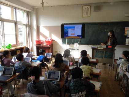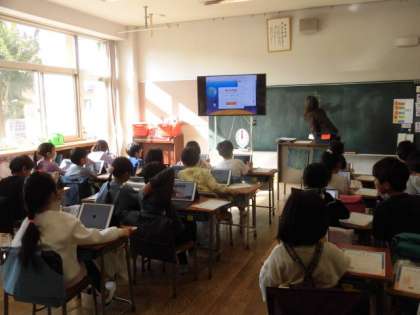 1年生の教室では、子どもたちがタブレットを使って学習していました。今日初めて使うものです。ゲストティチャーのお話をよく聞いて、使い方を習っていました。1年生でも、混乱することもなく学習に取り組んでいる様子で、感心しました。