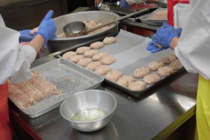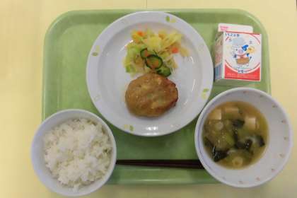 今日のごはんは、有機栽培で育てられた秋田県産のあきたこまちを使いました。有機栽培は自然の力で育てるため、土づくりから手間ひまかけて行われます。今日のハンバーグには豆腐が入っているので、ふんわりした食感に仕上がります。
