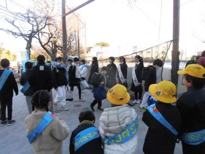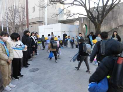 今日は「学び舎あいさつの日」です。自立の学び舎砧南中学校から中学生が来てくれました。校門は、1年生、中学生、5,6年生の大人数で、登校してくる子どもたちを迎えました。中学生に聞いたら「1年生オはとてもかわいいです」と言っていました。