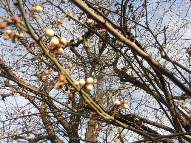 屋上のプールには氷が張り、寒い日が続いていますが、朝日に梅のつぼみが膨らんだところが、明るく輝いています。展覧会開催まであと1日となりました。朝の昇降口に掲示されたデジタルサイネージが示しています。準備は着々と進み、会場の仕上げは最終段階となりました。ぜひ大勢の皆さまがご来場くださること、お待ちしております。