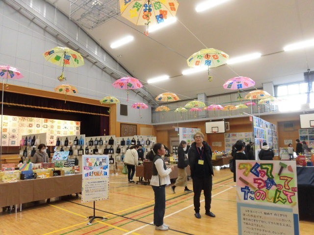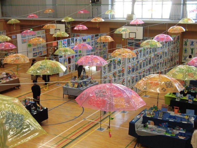 待ちに待った展覧会初日、午後からは大勢の保護者や地域の方が鑑賞に訪れています。上を見上げると、今年度初めて取り組んだ全校共同作品の傘の「花」が咲いています。それぞれの作品の前には、6年生の鑑賞ガイドがいて、いらした方々に作品についての解説や自分自身の感想などを伝えて、展覧会をさらに豊かなものにする役割を果たしています。「すばらしいですね」「とてもよくわかりました」「ありがとうございます」という言葉をたくさんいただいています。