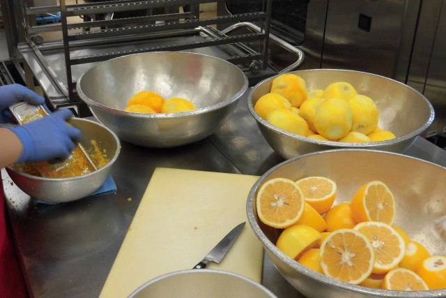 今日の主食は、八丈島レモンハニートーストです。東京の八丈島で生産されている「フルーツレモン」という品種のレモンを使っています。ほかのレモンと比べて、実が大きく、酸っぱくないのが特徴です。今日はすりおろした皮も入れました。サラダの白菜は東京都の瑞穂町でとれたものを使用しました。