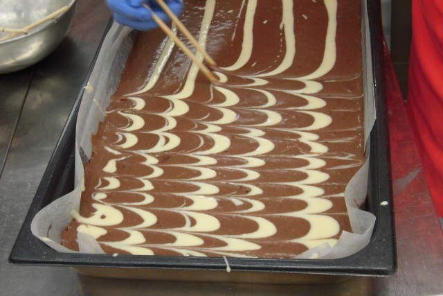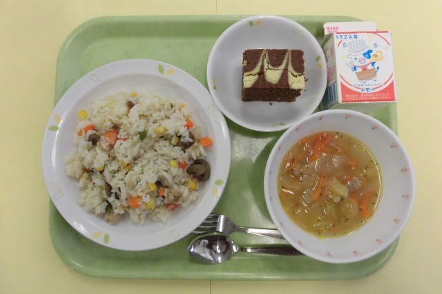 今日から展覧会が始まりました。みなさんが頑張って作った素敵な作品のように、給食室でもアートを取り入れた献立にしました。米粉ココアマーブルケーキは、ココア味の生地の上に、プレーン生地を垂らし、マーブル状に模様を描きました。ピラフやスープも色々な野菜を入れ、色とりどりに仕上げました。