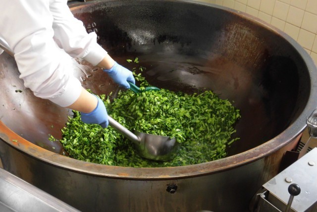 今日は「せたがやそだち」の給食です。世田谷区の農園で作られた小松菜をごはんに混ぜ込みました。世田谷区の農地は、東京都23区の中で2番目に大きく、様々な農作物が育てられています。
