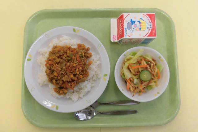 今日の給食はレンズ豆のドライカレーです。レンズ豆は、オレンジ色で丸く平たい形をしています。レンズ豆には、お腹の調子を整える食物繊維や貧血予防に良い鉄分など、多くの栄養素が含まれています。