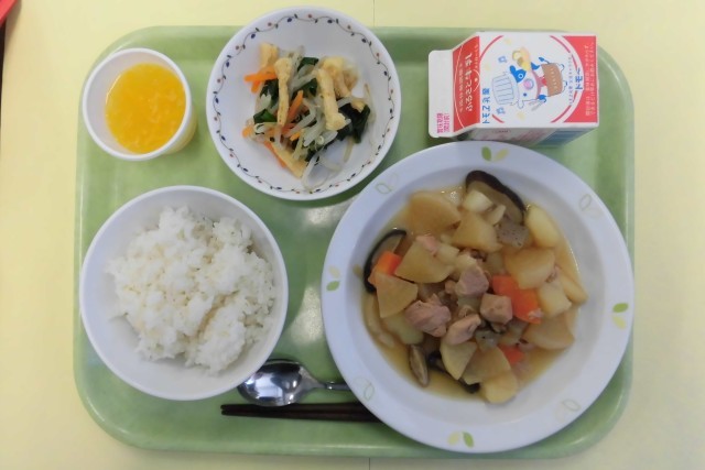 今日のデザートは、つぶつぶみかんゼリーです。みかんゼリーは、リクエスト給食のデザート部門で4位に選ばれました。今日のゼリーは缶詰のみかんをほぐし、つぶつぶの果肉がたくさん入っています。