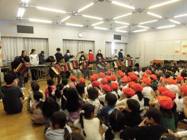 2月も中旬を過ぎ、学年の終わりが少しずつ近づいてきたのを感じます。中休みに音楽ホールで、音楽委員会が楽器を紹介し演奏をする会を催しました。割り当てとなっている学年の子どもたちが演奏を聴きにきました。上級生による演奏をじっと聴いていた子どもたちです。最後には「演奏を聴かせてくれてありがとうございました」と1年生の子どもから言葉がありました。