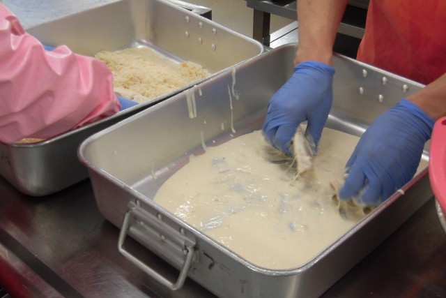 今日の主食と主菜は、セルフフィッシュサンドです。魚のフライを自分でパンにはさんで食べます。魚のフライは「ホキ」という白身魚にパン粉をつけて、衣がサクッとするように揚げました。