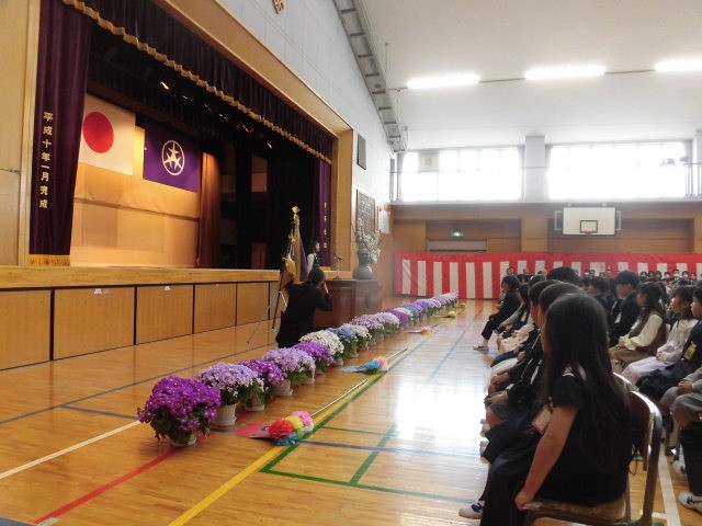 入学おめでとうございます。入学式には多くの御来賓の方々、保護者の方々、教職員が見守る中、165名の新入生を迎えました。何とか桜がもって欲しいという願いが叶い、少し散り始めた桜の舞う中、子どもたちが元気に登校してきました。式では校長先生の話をよく聞いて、問いかけたことに応えてくれました。