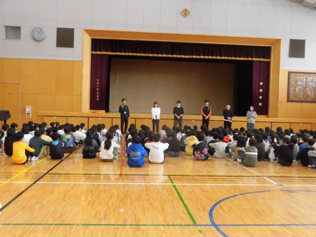 体育館では6年生が学年集会を行っていました。学年の先生のお話を聞く6年生は、最高学年としてのやる気に満ちていました。これから、いろいろなところでリーダーとしての活躍が期待される6年生です。