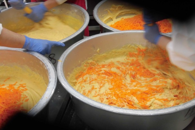 今日のデザートはキャロットケーキです。にんじんをケーキの生地に加えました。にんじんの濃いオレンジ色は、カロテンというビタミンの色で、かぜを予防する働きがあります。