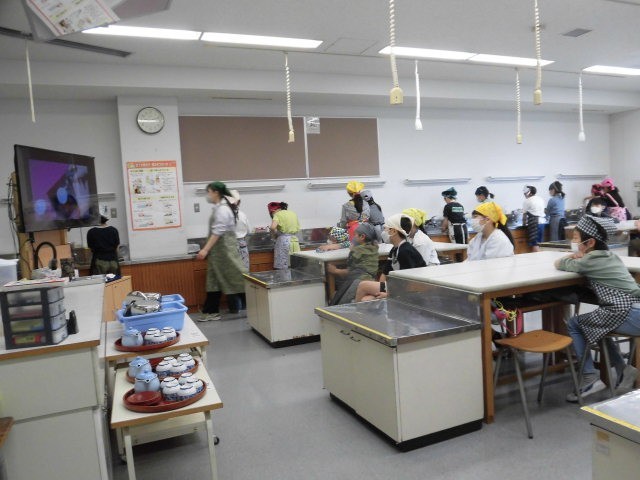 折しも、1年生が学校探検で巡ってきました。家庭科室に静かに入っていって、高学年の実習を見ていました。どんなことを感じたでしょう。