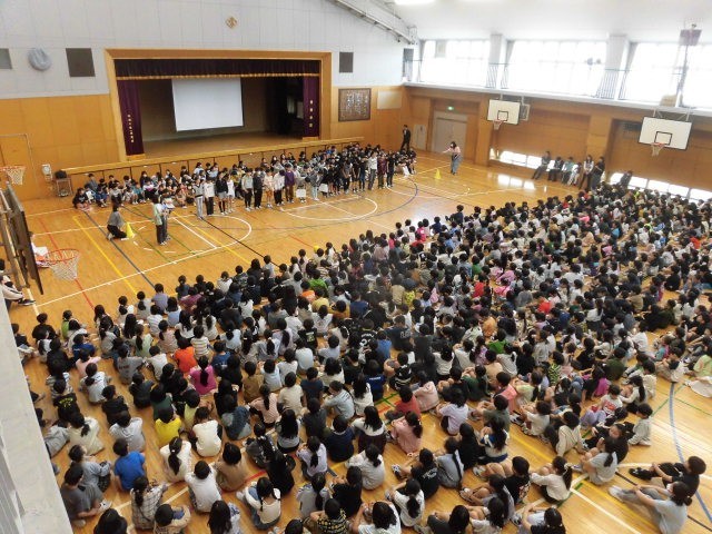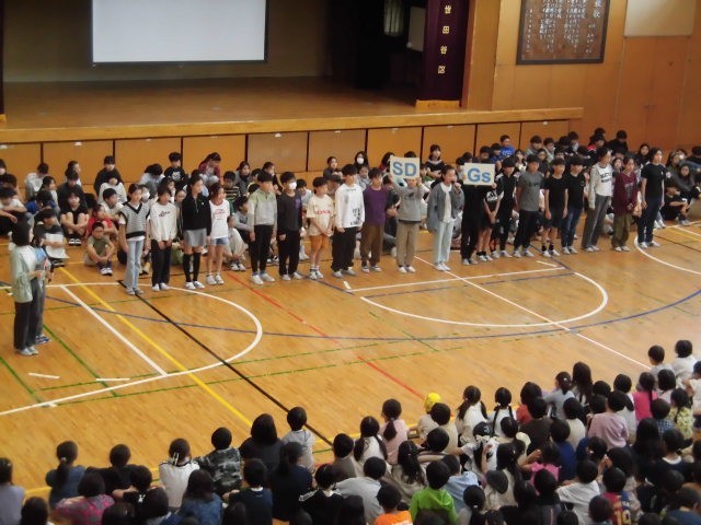 風薫る5月、さわやかな一日でした。朝の活動の時間に、体育館で委員会紹介集会を行いました。これで2回目となり、ようやくすべての委員会が紹介されたことになります。体育館いっぱいに1000人以上の子どもたちが集まって、じっと委員会の5,6年生の話を聞いています。