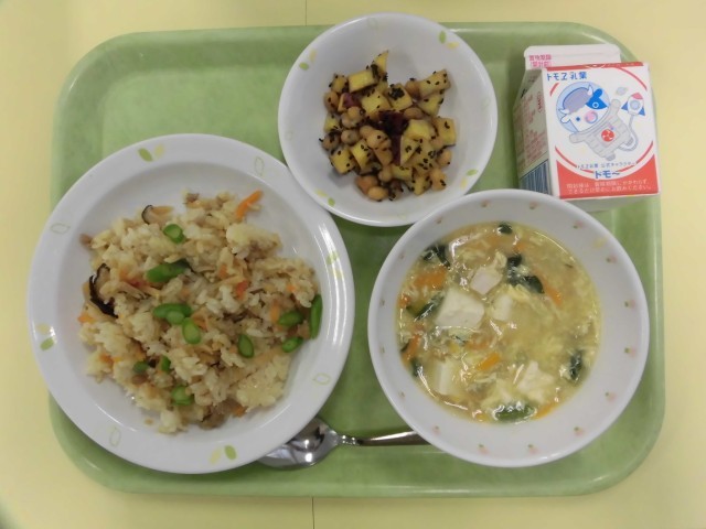 今日の給食は、5月5日の「こどもの日」にちなんだ献立です。今日の中華おこわには、たけのこが入っています。たけのこは、成長が早いため、大きく成長できるという意味がある縁起のよい食べ物です。子供たちの健やかな成長を願い、今日の給食に取り入れました。