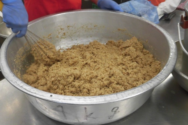 今日の主菜は、ポークビーンズです。豚肉と大豆を使ったトマト味の煮込み料理です。アメリカの家庭料理の一つです。豚肉には、体をつくるもとになるたんぱく質が多く含まれますが、大豆にもたんぱく質が多く含まれます。写真は、セサミトーストに塗るごま・バター・砂糖を混ぜている様子です。