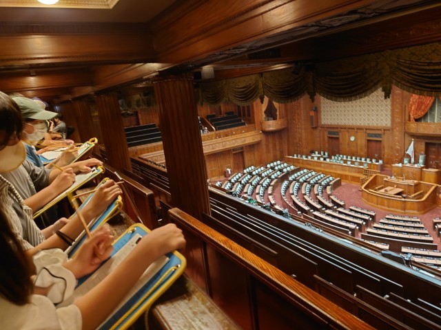 国会議事堂の施設を静かに見て回りました。ふかふかの赤い絨毯、大理石の壁、ステンドグラス、御休所、衆議院議場などゆっくりと見て歩きました。社会の時間に学んだことやそのときに浮かんだ疑問などを見学先での課題として用意しているので、説明を聞いたりその場所を見たりするときに考えている様子が見られます。