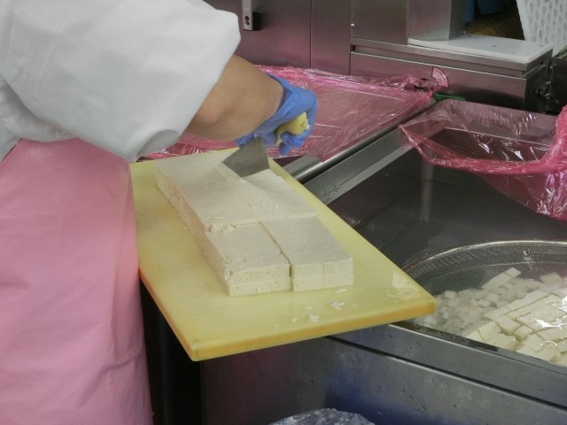 今日の主菜は西湖豆腐です。西湖豆腐は中国の料理です。漢字で西の湖と書きますが、これは中国にある「西湖」という湖の名前が由来となっています。マーボー豆腐に似ている料理ですが、辛みはなく、トマトとしょうゆで味付けしているのでさっぱりとした味わいです。写真は、108kgの豆腐を切っている様子です。