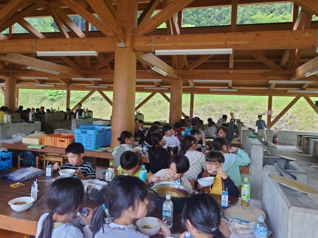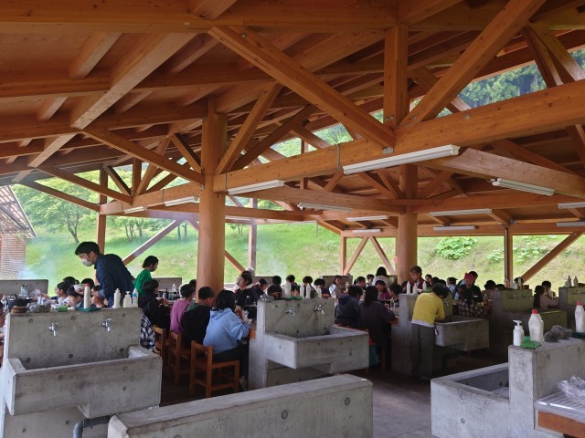 5年生川場移動教室、飯盒炊さんカレー作りです。かまど担当、カレー担当、飯盒担当に分かれて自分の仕事を頑張りました。なかなかうまく火が燃えなくて煙で大変てしたが、それぞれ力をあわせておいしいカレーが完成しました。いつもよりたくさん食べた子も多かったようです。
